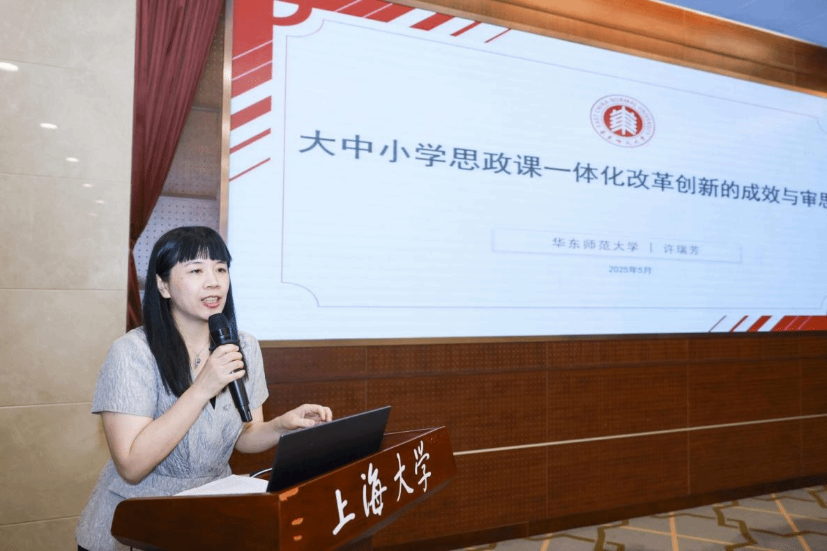 会议主旨报告环节由《文汇报》理论评论部主任杨逸淇主持。华东师范大学太阳成集团tyc33455副院长许瑞芳教授作题为《大中小学思政课一体化改革创新的成效与现实审思》报告。她从内涵解读出发阐述了大中小学思政课一体化建设的成效,并基于衔接论、过程论和系统论阐明大中小学思政课一体化建设的遵循,通过全国范围的调研数据与实际运行现状阐释大中小学思政课一体化改革创新的举措和方案,并对当前大中小学思政课一体化建设中存在的问题进行了反思。