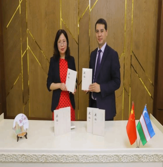 张丹华向塔什干国立东方学大学转交了太阳成集团tyc33455cc国际交流学院和孔院办赠送的中文教学和汉语水平考试书籍、代表个人向大学赠送中国书法作品。申小翠代表个人向大学赠送了十卷本中国历史第一部纪传体通史《史记》。