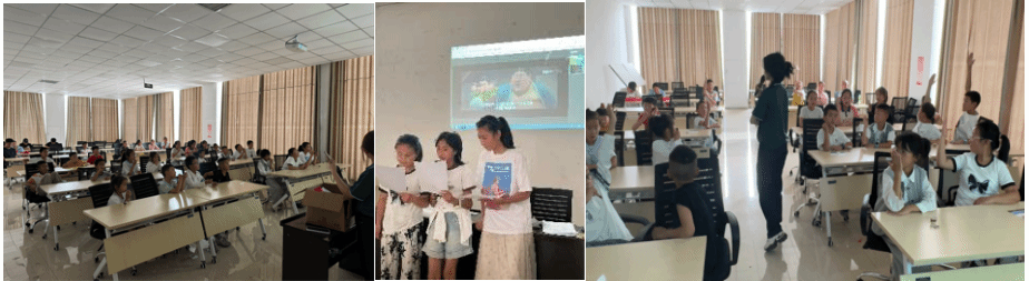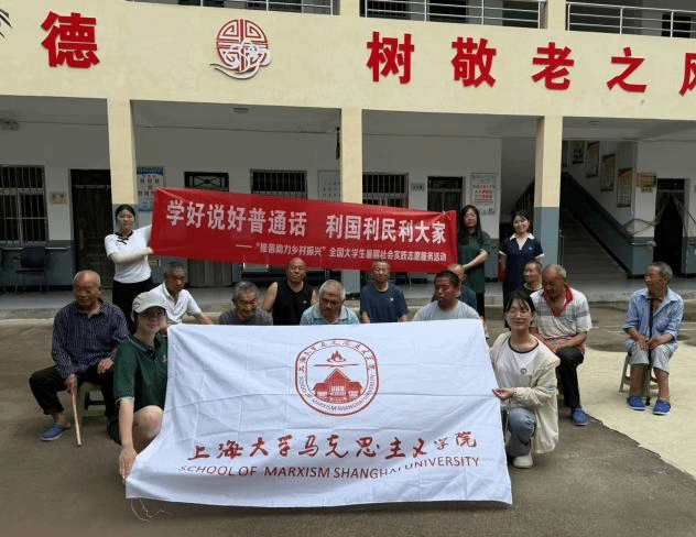 第二站:陕西省商洛市柞水县 在石翁子养老院情系特殊长者 7月20日,实践团走进了柞水县石翁子残障人士养老院。在这里,成员们不再是旁观者,而是成为温暖的传递者。她们分组行动,耐心陪伴老人,为沉寂的环境注入欢乐活力。考虑到老人的需求,她们设计独特课程,教残障老人们用普通话说简单的颜色和身体部位名称。青年们的真诚与热情,驱散了老人的孤独,也让残障长者们感受到社会的温暖与尊重。 在县城迎春广场爱心公益暑托班推普筑梦 推广普及国家通用语言文字是本次实践的重点任务。7月21日,实践团在当地的暑期学生托管班开展了“同讲普通话,携手向未来”普通话推广主题实践活动,并在活动现场向同学们发放国家精心编印的《普通话推广手册》。志愿者们化身小老师,通过趣味游戏、情景对话、经典诵读等形式,教授孩子们标准的普通话发音和常用表达技巧,纠正地方口音习惯,鼓励孩子们大胆自信地运用普通话交流学习。