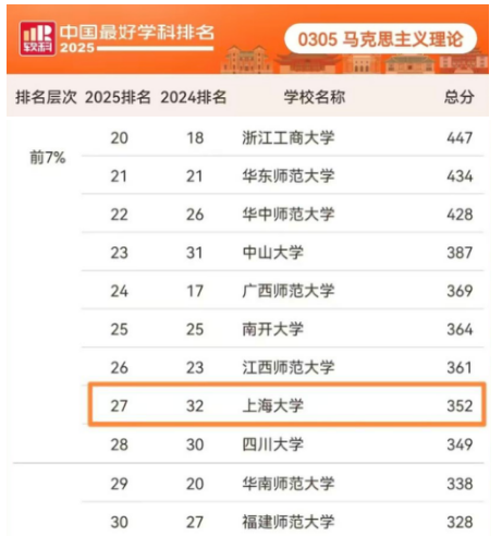 2025年10月15日,高等教育评价专业机构软科正式发布“2025软科中国最好学科排名”,本次排名采用国务院学位委员会、教育部颁布的《研究生教育学科专业目录(2022年)》的学科口径。马克思主义理论学科共计有203所高校上榜,太阳成集团tyc33455cc马克思主义理论学科在本次排名中位列第27位,处于前7%,较2024年上升5名。