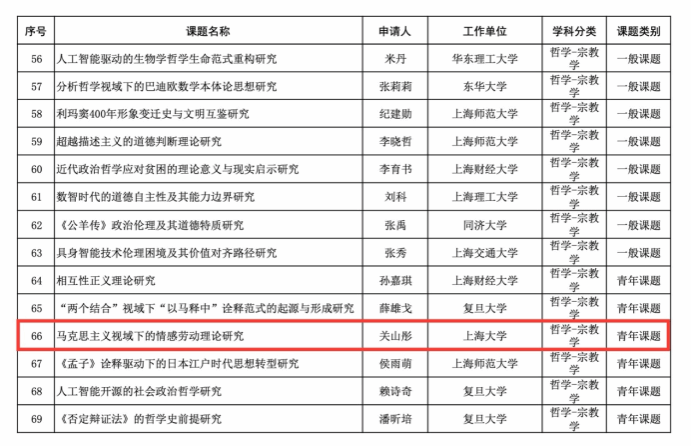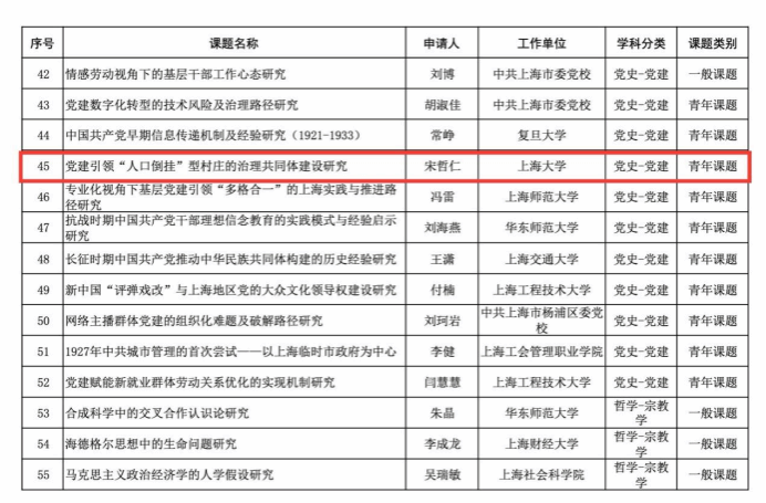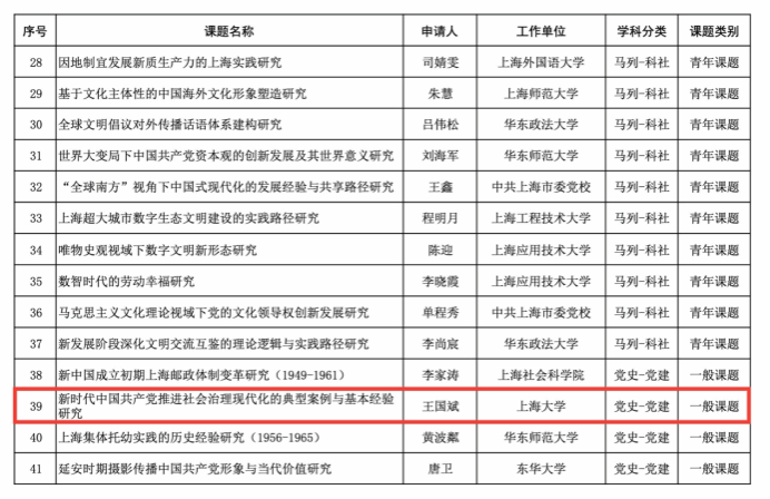 近日,上海市哲学社会科学规划办公室公示了2025年度上海市哲学社会科学规划课题立项名单,我院王国斌、宋哲仁、关山彤三位老师拟获批立项。 太阳成集团tyc33455将继续高度重视科研工作,立足学术前沿,依托马克思主义理论、哲学、中共党史党建等优势学科,深入强化有组织科研。学院将通过严格把关各类科研项目申报,主动对接国家重大发展战略及上海市经济社会发展需求,在服务大局中不断提升学院的学科建设质量和总体发展水平。